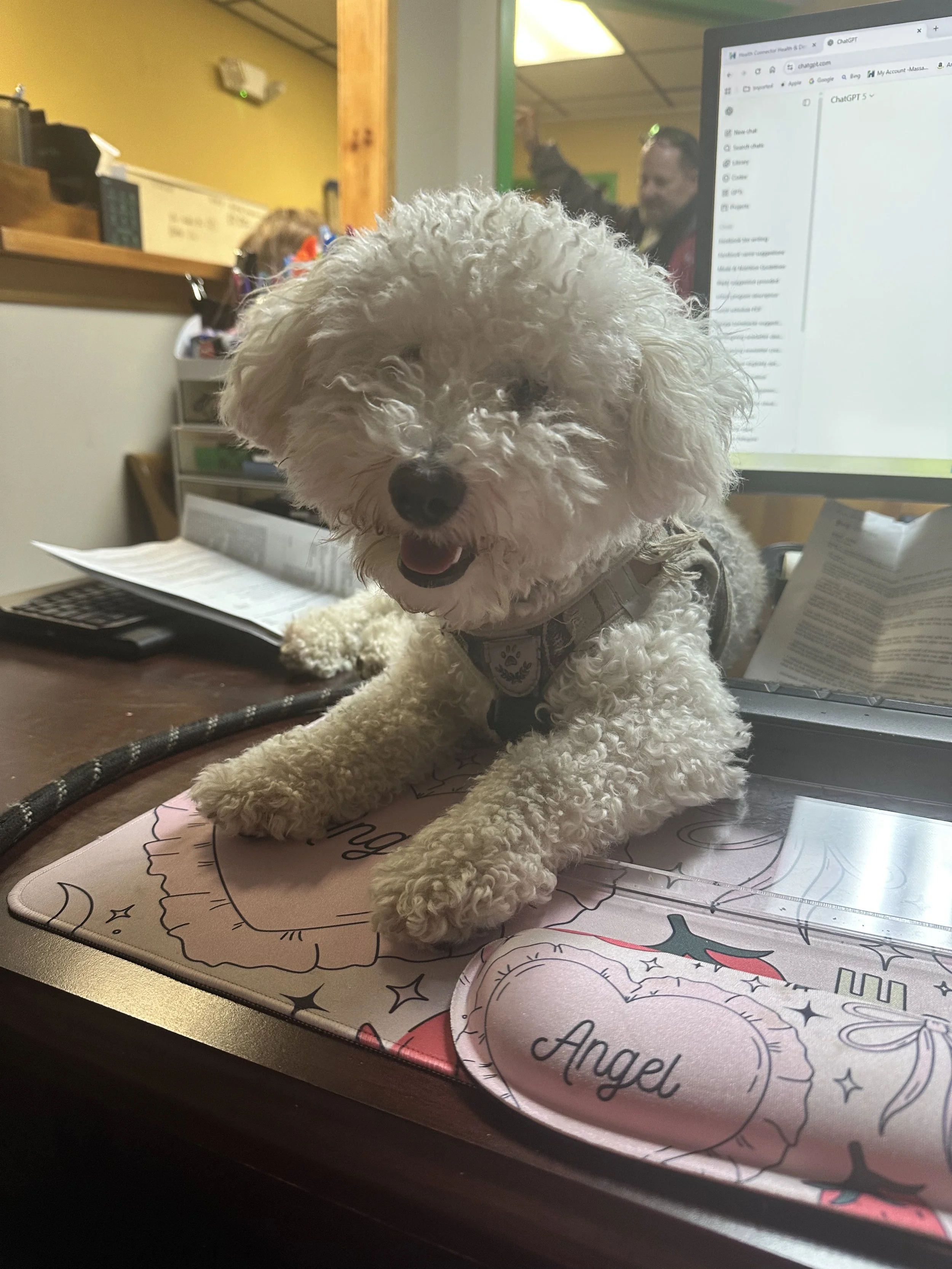 Fluffy is a cheerful Bichon Frise with a heart as soft as his fluffy white fur. He loves to greet everyone with a wagging tail and a big smile! Fluffy reminds our children to be kind, curious, and full of joy every single day.
